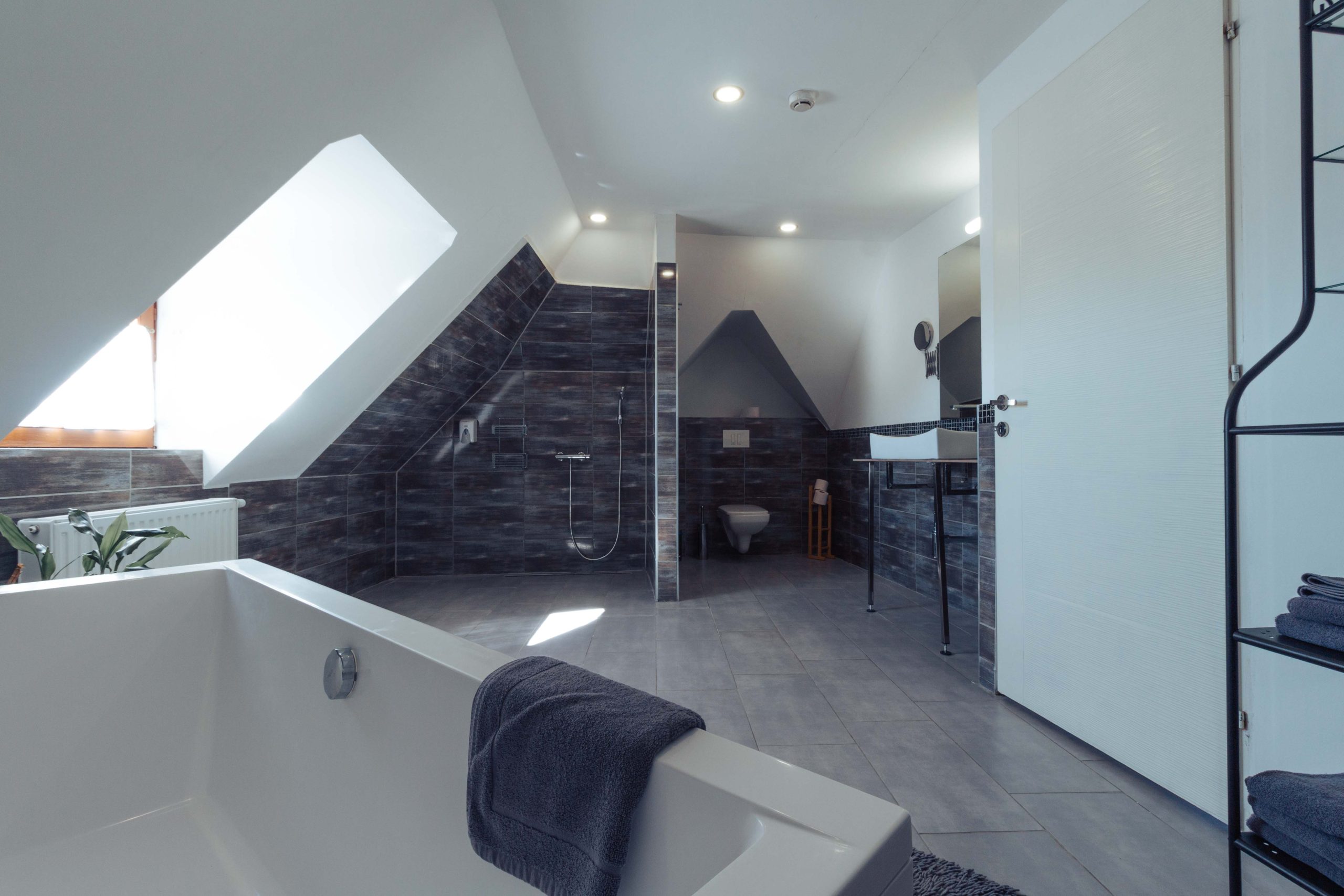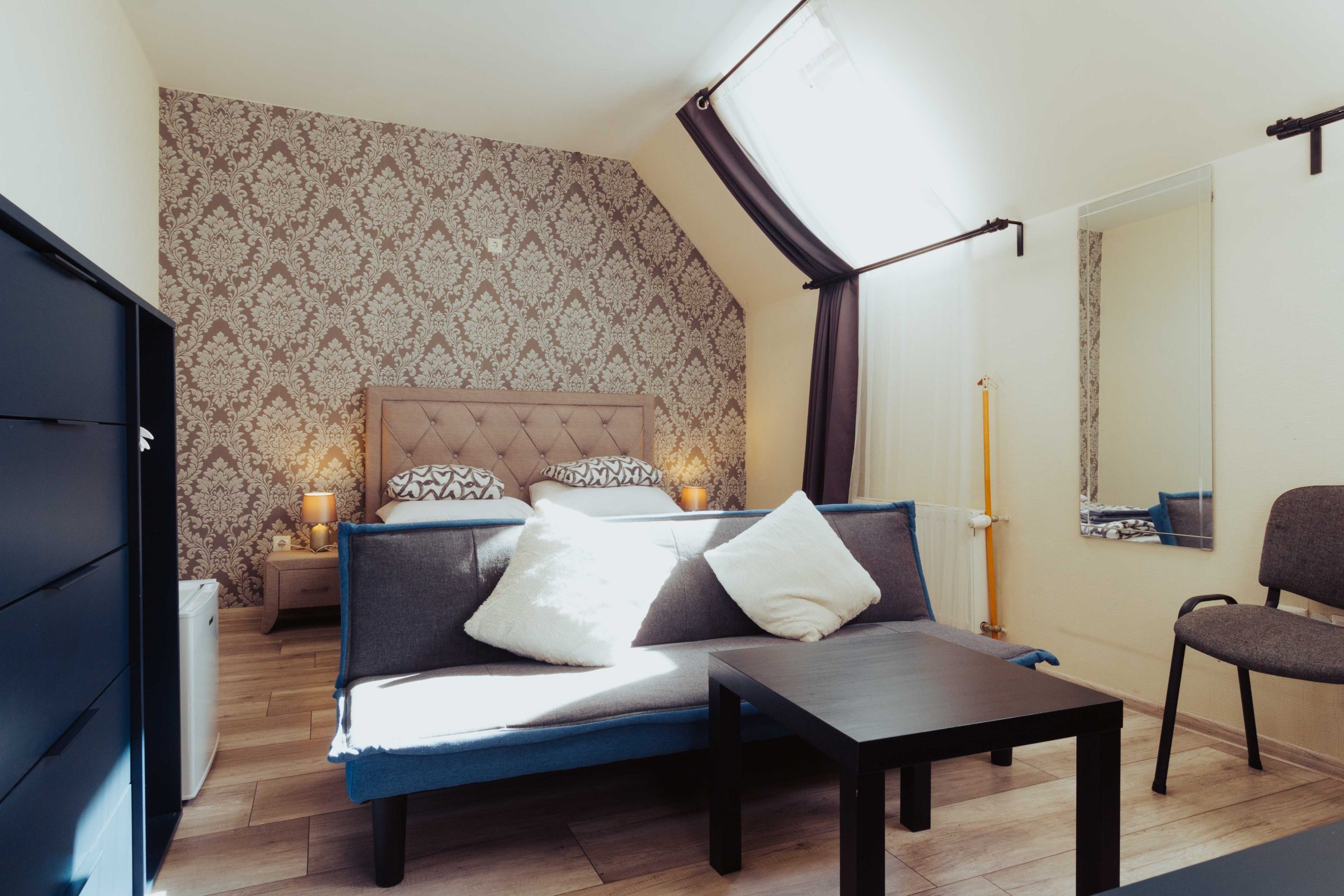 Tetőtéri 3 ágyas lakosztály, óriás fürdőszobával. Szerelmes párok kedvence.
