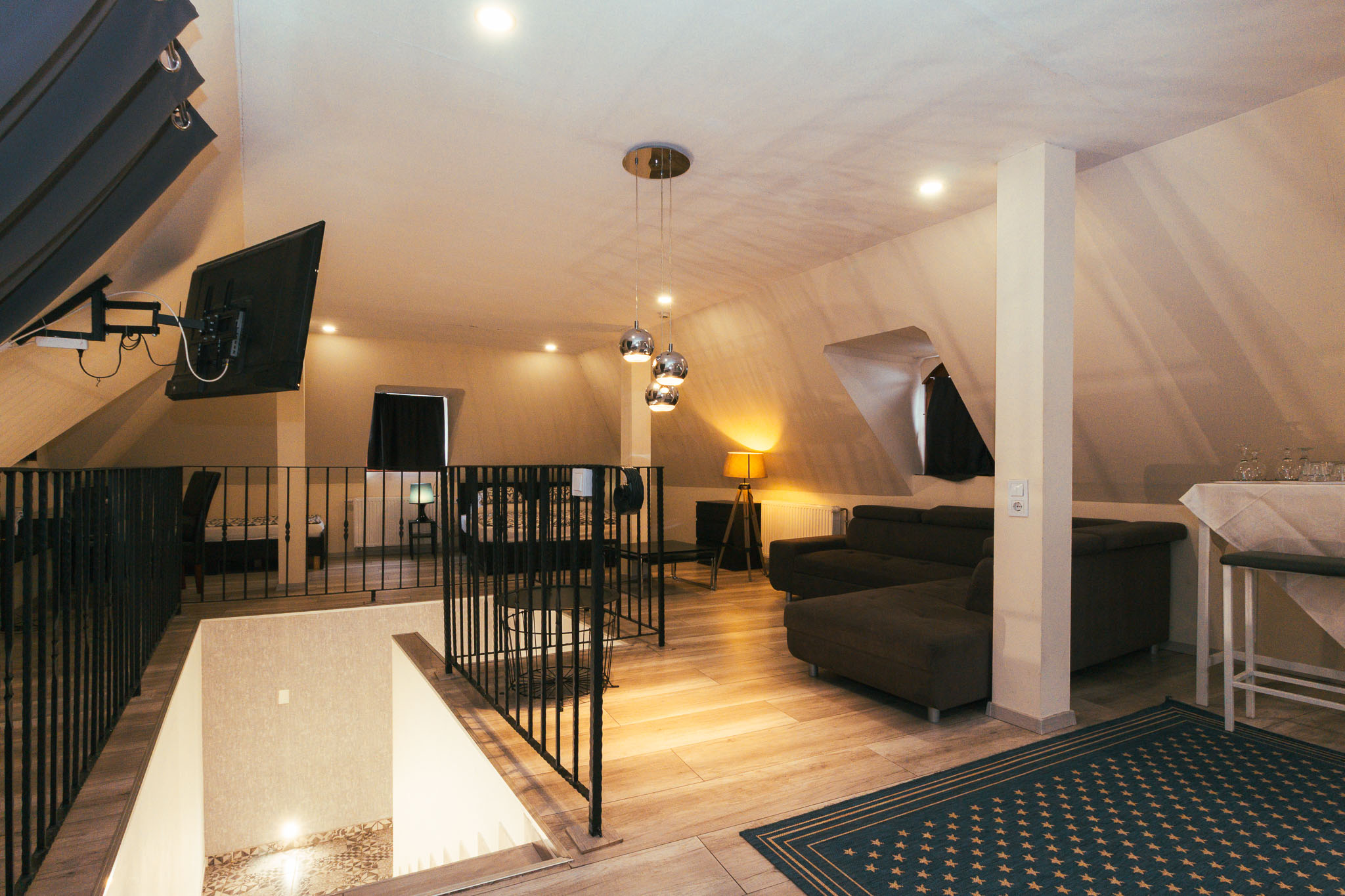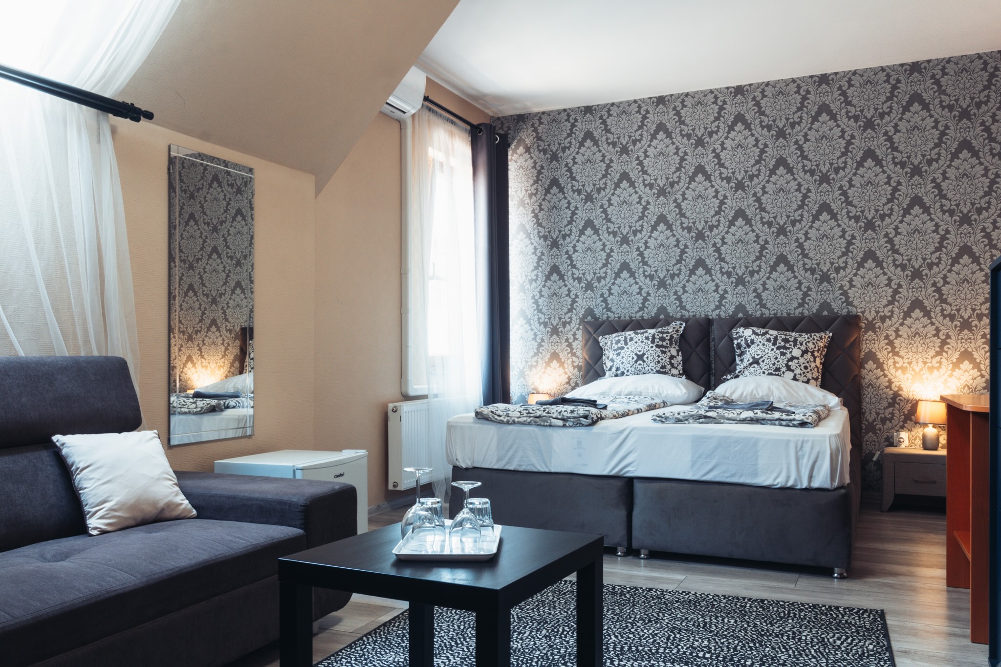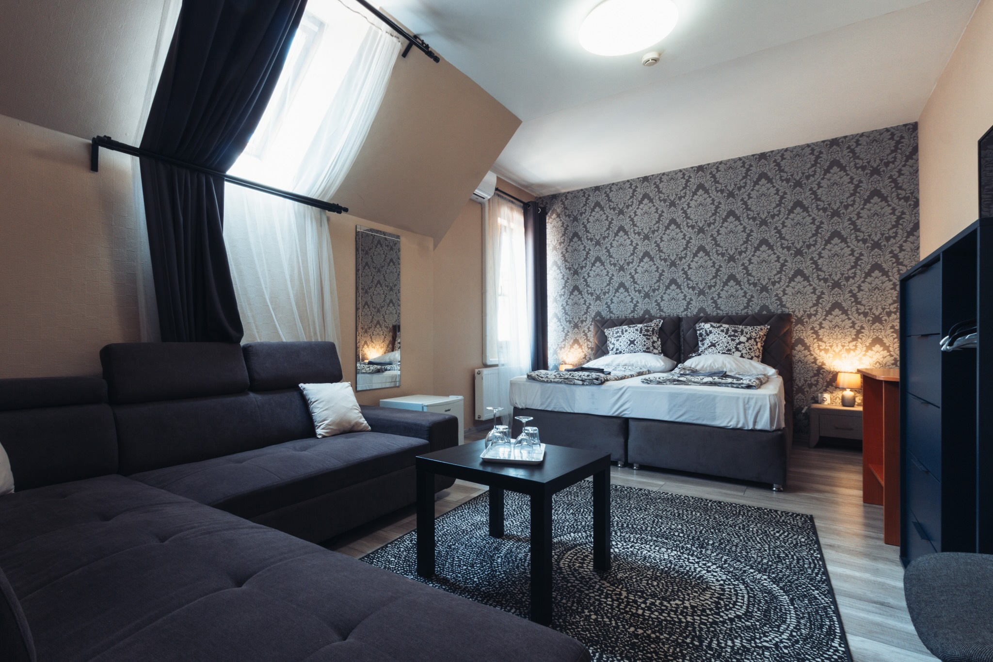 Két különággyal, sarokkanapéval és két légtérrel rendelkező szoba.
