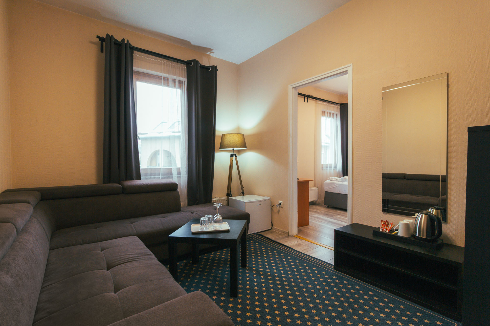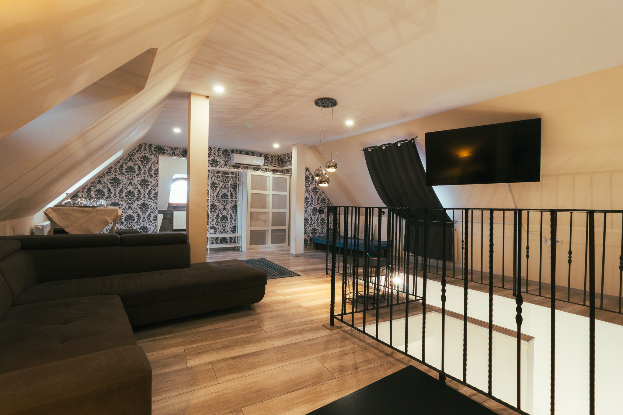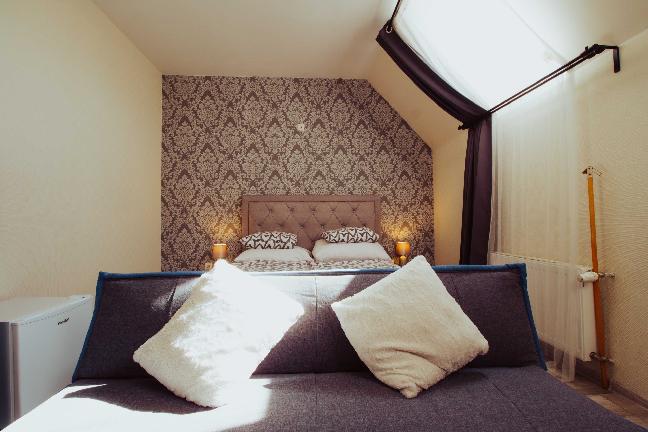 Két különággyal, sarokkanapéval és két légtérrel rendelkező szoba.